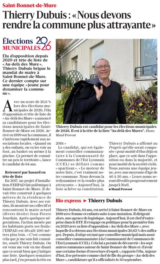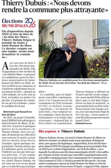 Le 27 octobre dernier, vous avez peut-être pu voir l'article dans Le Progrès qui présentait ma candidature à la tête de la liste Saint-Bonnet de Mure 2026.